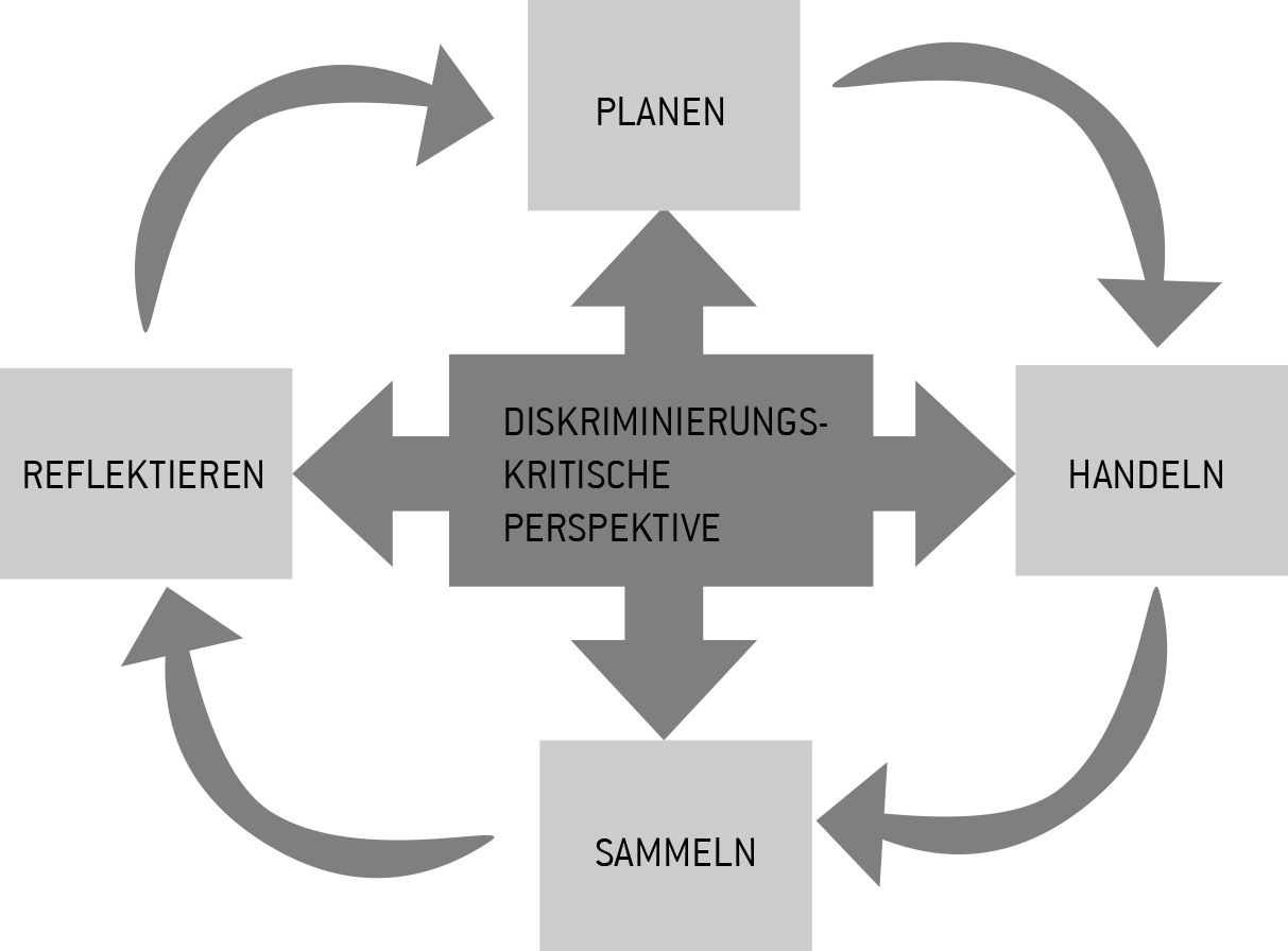 Ähnlich wie bei ASD soll das Curriculum ein verwebendes Wechselspiel von Schulung und Praxisforschung, von der Auseinandersetzung mit diskriminierungskritischen Konzepten zu deren Verortung und Erprobung in der eigenen Berufspraxis und zurück initiieren. Die dabei entstehenden und sich ausdifferenzierenden Fragen werden in der Lerngruppe diskutiert und resultieren wiederum in neuen Versuchen auf der Handlungsebene sowie in neuen Lektüren. Damit ist der klassische Zyklus der Aktionsforschung beschrieben, wobei die diskriminierungskritische Perspektive in diesem Fall die konzeptuelle und handlungsleitende Matrix darstellt (siehe Abb. 1).