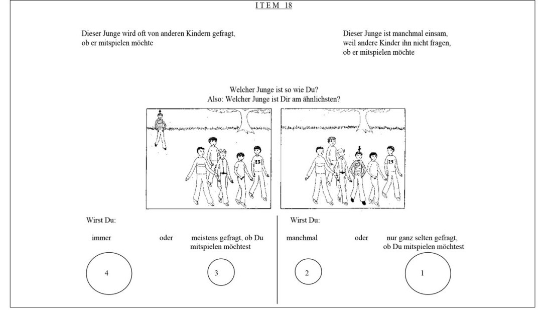 Das Selbstkonzept der Kinder wurde über die deutschsprachige Version des Pictorial Scale of Perceived Competence and Social Acceptance for Young Children (PSCA; nach Aspendorpf/van Aken 1993:64-86) mit Bildversionen zum besseren Verständnis der Items erfasst. Im Rahmen einer schriftlichen Befragung wurden die Dimensionen der kognitiven Kompetenz, der Sportkompetenz und der sozialen Akzeptanz erfragt. Jede Skala umfasst in der ursprünglichen Fassung vier Fragen, wobei die Skala zur Sportkompetenz nach Auswertung der Pretests um zwei eigens formulierte Items zur Erhöhung der Reliabilität der Skala ergänzt wurde (Beispielfrage in Abb. 4). Erneut berechnete Reliabilitäten der Subskalen zum Messzeitpunkt 1 waren ausreichend (Chronbachs alpha: 0.68-0.86).