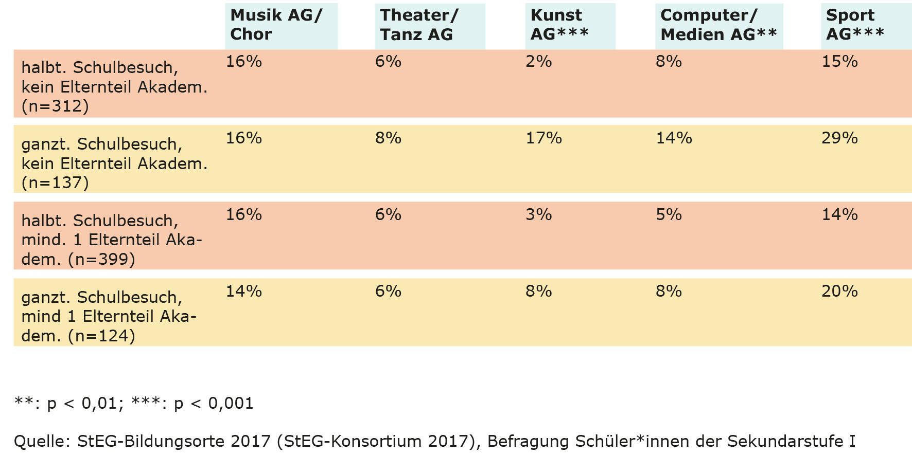 Tab. 1: Teilnahme an außerunterrichtlichen schulischen Aktivitäten nach Ganztagsschulbesuch und Bildungsstand der Eltern (11-17-Jährige*)