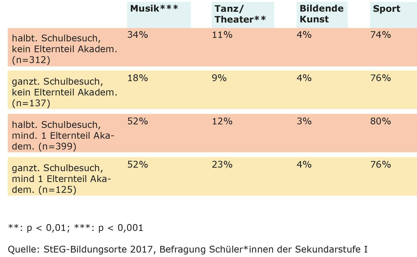 Schaut man hier auf den Unterschied zwischen Ganz- und Halbtagsschüler*innen zeigt sich, dass die Halbtagsschüler*innen insgesamt aktiver im Bereich von organisierten Musikaktivitäten – deren Wahrnehmung sich stark nach Bildungsstand der Eltern unterscheidet – sind. Im Bereich Theater/Tanz sind auch bei außerschulischen Aktivitäten insgesamt die Ganztagsschüler*innen überrepräsentiert. Für Aktivitäten der bildenden Künste und im Sport zeigen sich keine signifikanten Unterschiede zwischen den Gruppen.