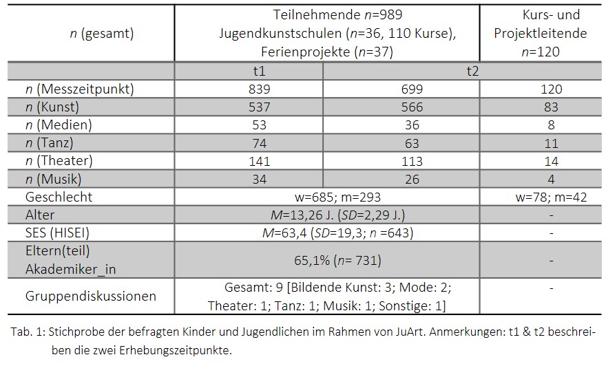 Das vom Rat für Kulturelle Bildung im Zeitraum von 2015 bis 2018 geförderte JuArt Forschungsvorhaben wurde kooperativ von der Universität Kassel und der Philipps-Universität Marburg durchgeführt. Die Daten wurden mittels einer standardisierten, längsschnittlichen Fragebogenbefragung (Zeitraum Juni 2015 bis Juli 2016) und mittels Gruppendiskussionen mit älteren Kindern und Jugendlichen (Zeitraum Juli 2015 bis Mai 2016) erhoben.