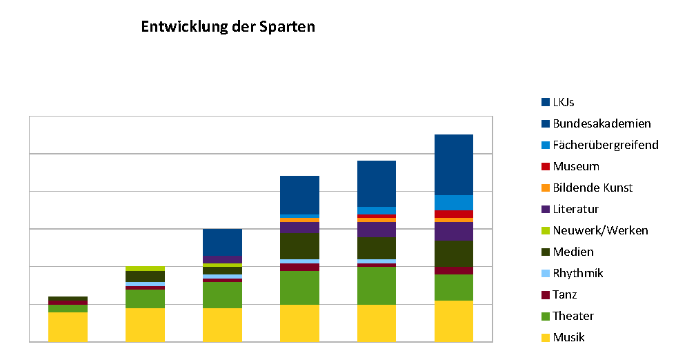 Die gesellschaftliche Anerkennung der Kulturellen Bildung drückt sich auch aus durch die Mitgliedschaften des Deutschen Bibliotheksverbandes sowie des Arbeitskreises für Schulmusik, Vision Kino – Netzwerk für Film- und Medienkompetenz, des Bundesverbandes Tanz in Schulen und der Yehudi Menuhin Stiftung Deutschland, die an der Schnittstelle Schule agieren. Bis 2014 gewann die BKJ 13 neue Mitgliedorganisationen hinzu. Die folgende Grafik verdeutlich die Zuordnung der Mitglieder zu den unterschiedlichen Kunstsparten und kunstsparten-übergreifenden Landesvereinigungen (LKJs) in den untersuchten 5 Dekaden.
