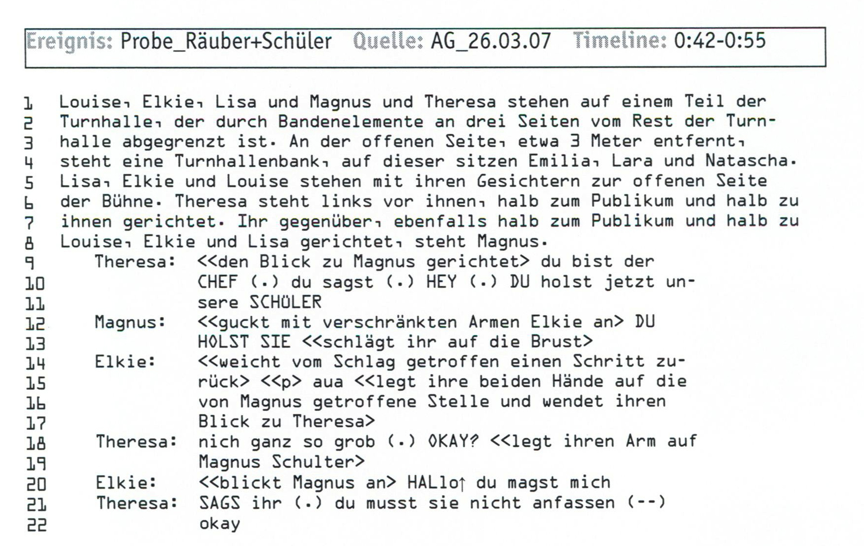 Für die sich anschließende Feinanalyse von Sequenzen lohnt es sich, ausgewählte Sequenzen in einen Text zu überführen. Diese Überführung geschieht dadurch, dass ein Transkript des Videoausschnitts erstellt wird, indem Teile der Handlung beschrieben werden und Gesprochenes konversationsanalytisch eingefügt wird.