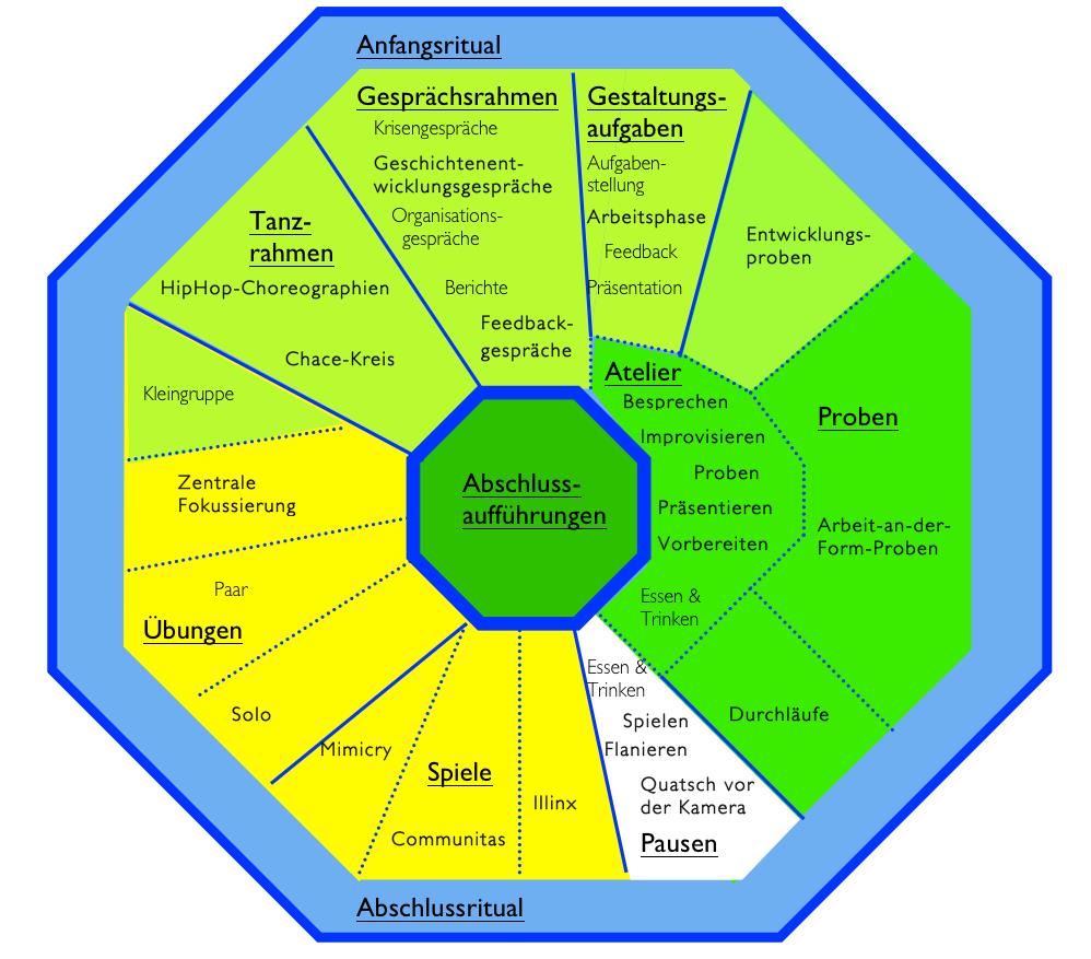 Pausen und die Rahmen, die dort von den TeilnehmerInnen realisiert wurden, wurden ebenfalls als Teil der Lernkultur verstanden, die Hauptrahmen waren dort „Essen&Trinken“, verschiedene Spiele – unter anderen „Quatsch vor der Kamera“ und „Flanieren“. Proben stellen eine weitere wichtige Gruppe von Rahmen dar, die sich in „Entwicklungsproben“, „Arbeit-an-der-Form-Proben“ und „Durchläufe“ unterteilen lassen. In der Mitte der Darstellung stehen schließlich die Abschlussaufführungen, die sich durch den Einbezug von Publikum stark von allen anderen Rahmen unterscheiden und die vor allem deshalb sehr interessant sind, weil die TeilnehmerInnen in den Abschlussaufführungen eine hohe gemeinsame Verantwortung für das Gelingen der Darstellung tragen.